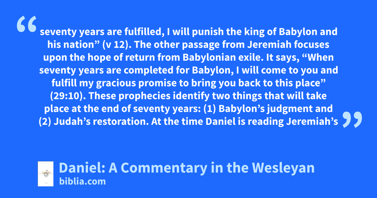 seventy years are fulfilled, I will punish the king of Babylon and his nation” (v 12). The other passage from Jeremiah focuses upon the hope of return from Babylonian exile. It says, “When seventy years are completed for Babylon, I will come to you and fulfill my gracious promise to bring you back to this place” (29:10). These prophecies identify two things that will take place at the end of seventy years: (1) Babylon’s judgment and (2) Judah’s restoration. At the time Daniel is reading Jeremiah’s
