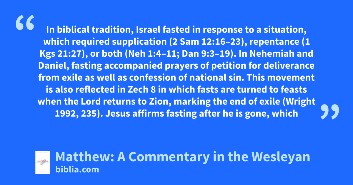 In biblical tradition, Israel fasted in response to a situation, which required supplication (2 Sam 12:16–23), repentance (1 Kgs 21:27), or both (Neh 1:4–11; Dan 9:3–19). In Nehemiah and Daniel, fasting accompanied prayers of petition for deliverance from exile as well as confession of national sin. This movement is also reflected in Zech 8 in which fasts are turned to feasts when the Lord returns to Zion, marking the end of exile (Wright 1992, 235). Jesus affirms fasting after he is gone, which