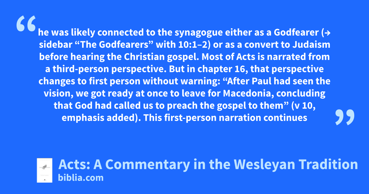 he was likely connected to the synagogue either as a Godfearer (→ sidebar “The Godfearers” with 10:1–2) or as a convert to Judaism before hearing the Christian gospel. Most of Acts is narrated from a third-person perspective. But in chapter 16, that perspective changes to first person without warning: “After Paul had seen the vision, we got ready at once to leave for Macedonia, concluding that God had called us to preach the gospel to them” (v 10, emphasis added). This first-person narration continues