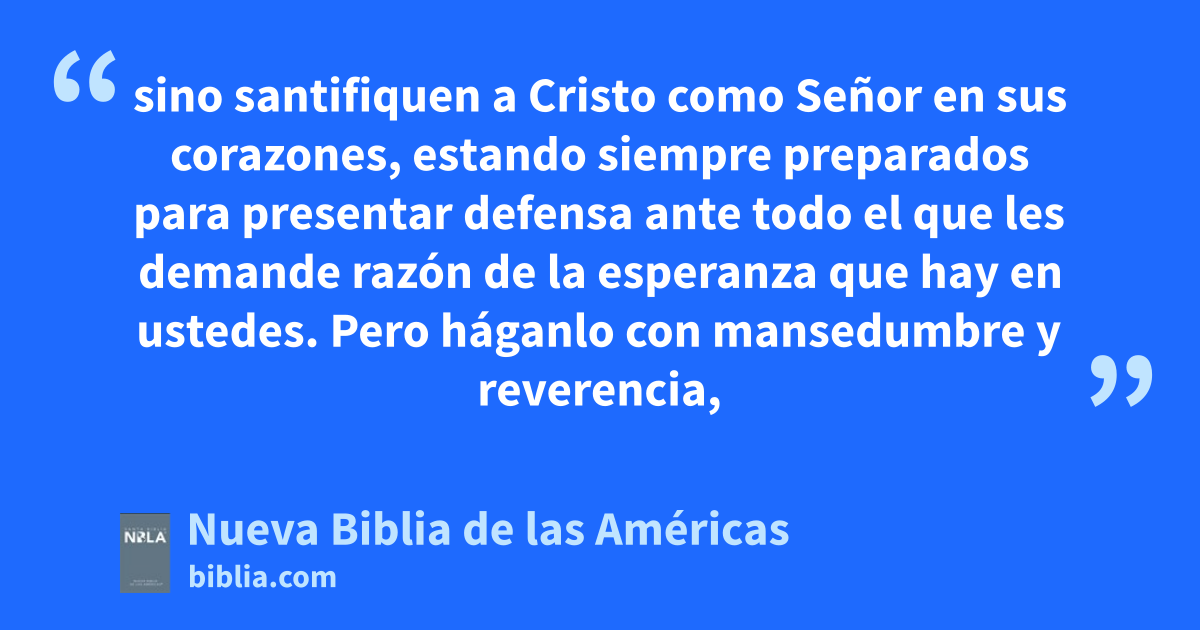15 sino santifiquen a Cristo como Señora en sus corazones, estando siempre preparados para presentar defensab ante todo el que les demande razón de1 la esperanza que hay en ustedesc. Pero háganlo con mansedumbred y reverencia2e,