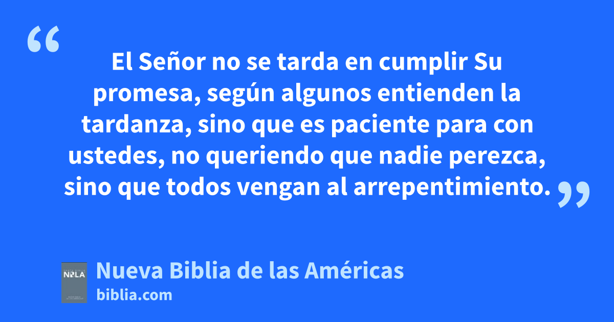 9 El Señor no se tardaa en cumplir Su promesa, según algunos entienden la tardanza, sino que es pacienteb para con ustedes1, no queriendo que nadie perezca, sino que todos vengan al arrepentimiento2c.