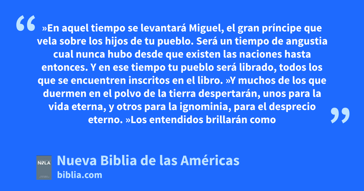 12 »En aquel tiempo se levantará Miguel, el gran príncipea que vela sobre1 los hijos de tu pueblo. Será un tiempo de angustiab cual nunca hubo desde que existen las naciones hasta entonces. Y en ese tiempo tu pueblo será libradoc, todos los que se encuentren inscritos en el librod.
