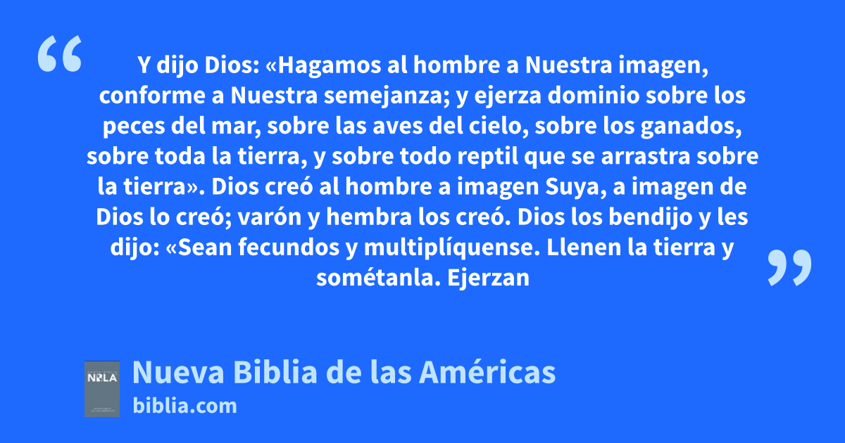26 Y dijo Dios: «Hagamosa al hombre a Nuestra imagen, conforme a Nuestra semejanzab; y ejerza1 dominio sobre los peces del mar, sobre las aves del cielo, sobre los ganados, sobre toda la tierra, y sobre todo reptil que se arrastra sobre la tierrac».