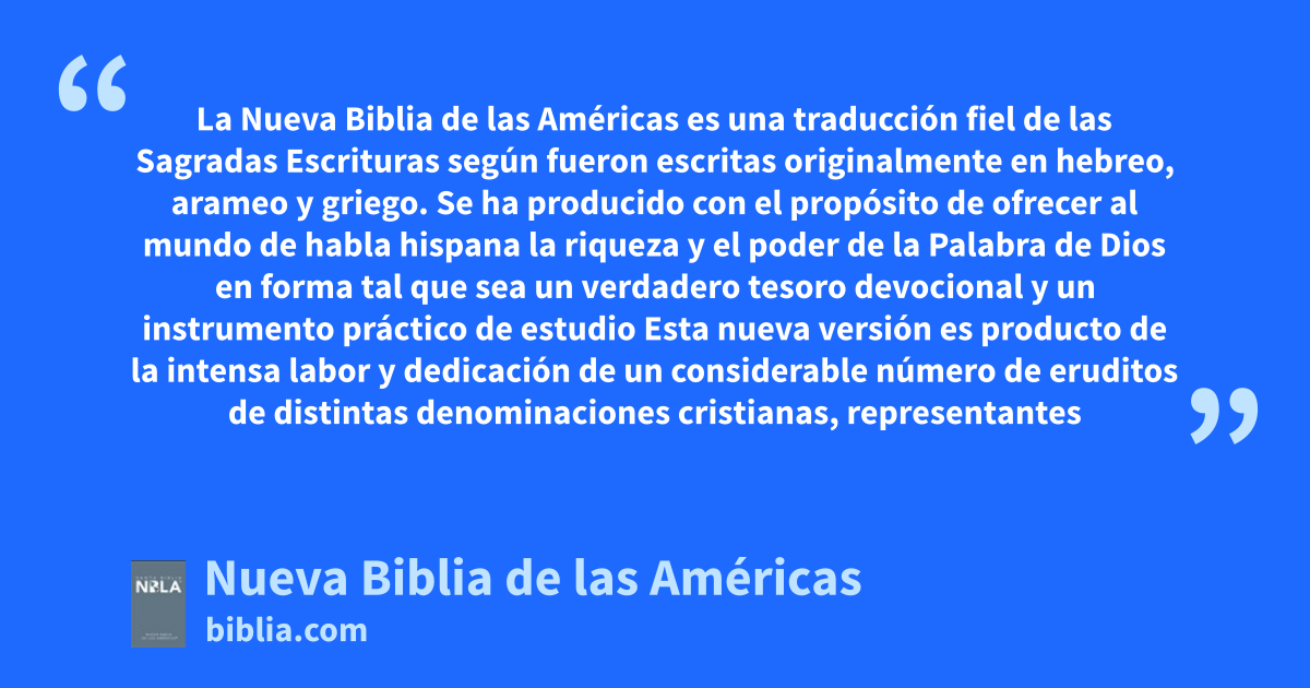 La Nueva Biblia de las Américas es una traducción fiel de las Sagradas Escrituras según fueron escritas originalmente en hebreo, arameo y griego. Se ha producido con el propósito de ofrecer al mundo de habla hispana la riqueza y el poder de la Palabra de Dios en forma tal que sea un verdadero tesoro devocional y un instrumento práctico de estudio