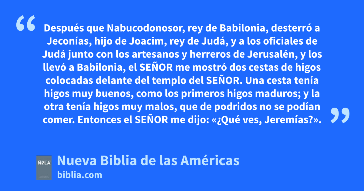 24 Después que Nabucodonosor, rey de Babilonia, desterró a Jeconías, hijo de Joacim, rey de Judá, y a los oficiales de Judá junto con los artesanos y herreros de Jerusalén, y los llevó a Babiloniaa, el Señor me mostró dos cestas de higosb colocadas delante del templo del Señor.