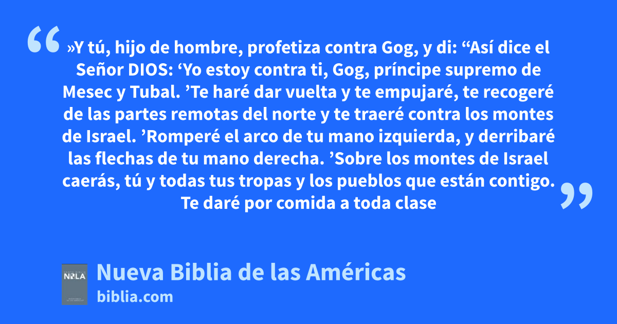 39 »Y tú, hijo de hombre, profetiza contra Gog, y di: “Así dice el Señor Dios: ‘Yo estoy contra ti, Gog, príncipe supremo de Mesec y Tubala.