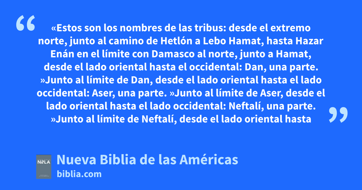 48 «Estos son los nombres de las tribusa: desde el extremo norte, junto al camino de Hetlón a Lebo Hamat, hasta Hazar Enán en el límite con Damasco al norte, junto a Hamat, desde el lado oriental hasta el occidental: Danb, una parte.