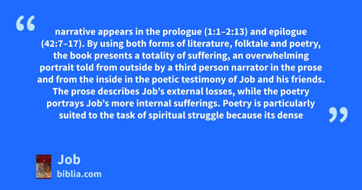 narrative appears in the prologue (1:1–2:13) and epilogue (42:7–17). By using both forms of literature, folktale and poetry, the book presents a totality of suffering, an overwhelming portrait told from outside by a third person narrator in the prose and from the inside in the poetic testimony of Job and his friends. The prose describes Job’s external losses, while the poetry portrays Job’s more internal sufferings. Poetry is particularly suited to the task of spiritual struggle because its dense