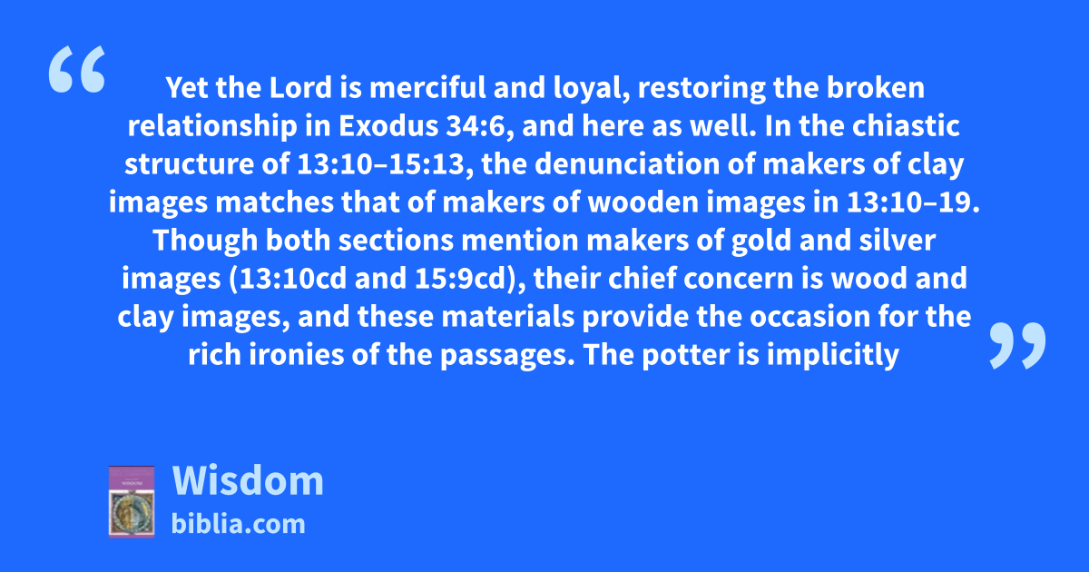 Yet the Lord is merciful and loyal, restoring the broken relationship in Exodus 34:6, and here as well. In the chiastic structure of 13:10–15:13, the denunciation of makers of clay images matches that of makers of wooden images in 13:10–19. Though both sections mention makers of gold and silver images (13:10cd and 15:9cd), their chief concern is wood and clay images, and these materials provide the occasion for the rich ironies of the passages. The potter is implicitly