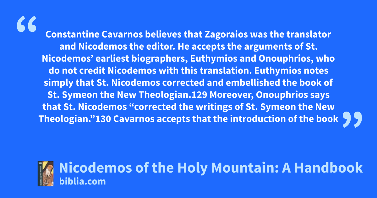 Constantine Cavarnos believes that Zagoraios was the translator and Nicodemos the editor. He accepts the arguments of St. Nicodemos’ earliest biographers, Euthymios and Onouphrios, who do not credit Nicodemos with this translation. Euthymios notes simply that St. Nicodemos corrected and embellished the book of St. Symeon the New Theologian.129 Moreover, Onouphrios says that St. Nicodemos “corrected the writings of St. Symeon the New Theologian.”130 Cavarnos accepts that the introduction of the book