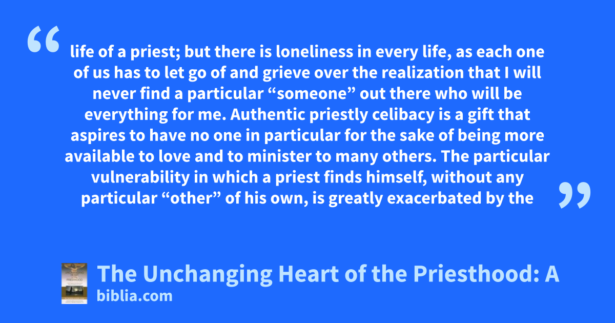 life of a priest; but there is loneliness in every life, as each one of us has to let go of and grieve over the realization that I will never find a particular “someone” out there who will be everything for me. Authentic priestly celibacy is a gift that aspires to have no one in particular for the sake of being more available to love and to minister to many others. The particular vulnerability in which a priest finds himself, without any particular “other” of his own, is greatly exacerbated by the