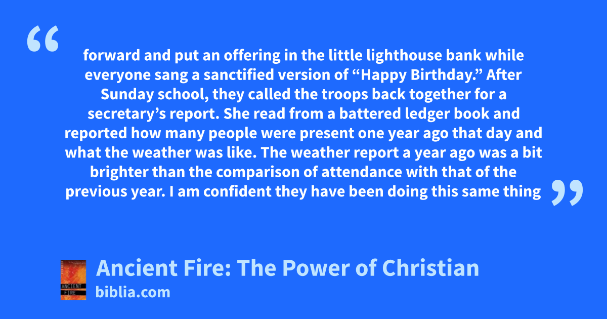 forward and put an offering in the little lighthouse bank while everyone sang a sanctified version of “Happy Birthday.” After Sunday school, they called the troops back together for a secretary’s report. She read from a battered ledger book and reported how many people were present one year ago that day and what the weather was like. The weather report a year ago was a bit brighter than the comparison of attendance with that of the previous year. I am confident they have been doing this same thing