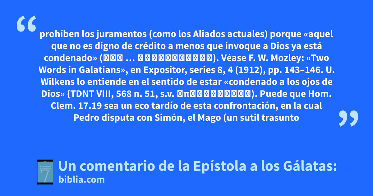 prohíben los juramentos (como los Aliados actuales) porque «aquel que no es digno de crédito a menos que invoque a Dios ya está condenado» (ἤδη … κατεγνῶσθαι). Véase F. W. Mozley: «Two Words in Galatians», en Expositor, series 8, 4 (1912), pp. 143–146. U. Wilkens lo entiende en el sentido de estar «condenado a los ojos de Dios» (TDNT VIII, 568 n. 51, s.v. ὑποκρίνομαι). Puede que Hom. Clem. 17.19 sea un eco tardío de esta confrontación, en la cual Pedro disputa con Simón, el Mago (un sutil trasunto