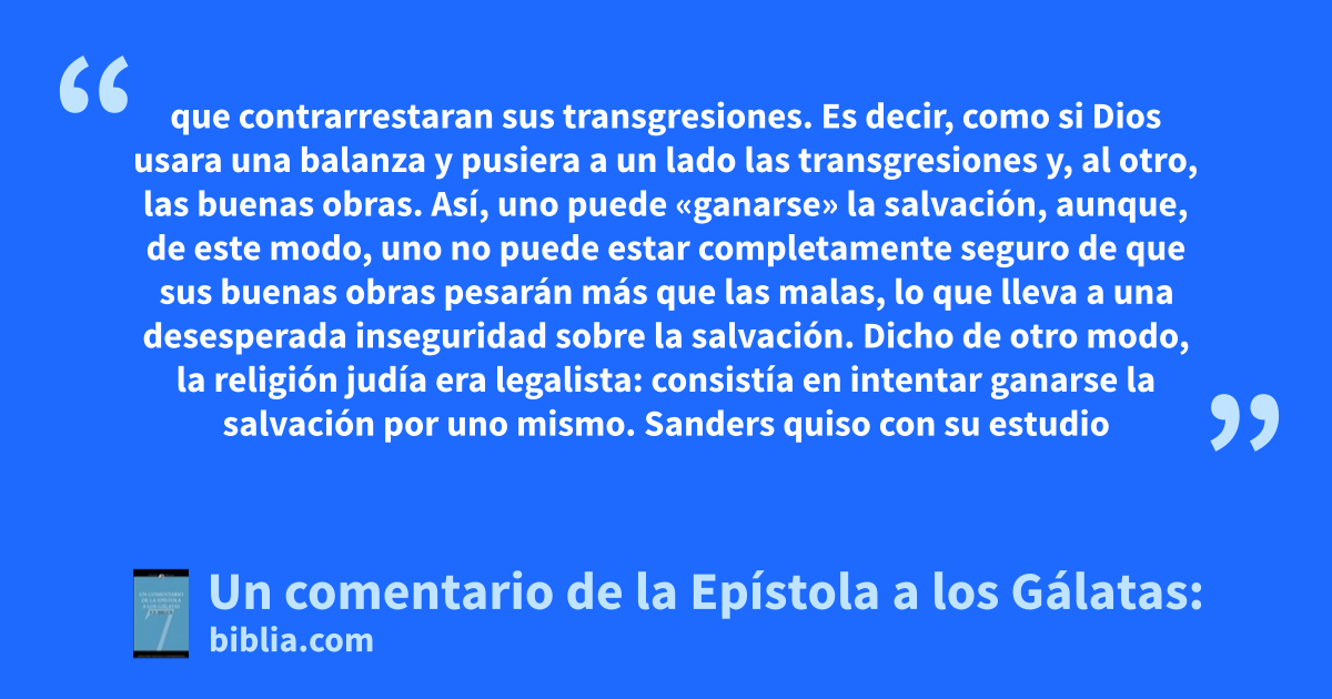 que contrarrestaran sus transgresiones. Es decir, como si Dios usara una balanza y pusiera a un lado las transgresiones y, al otro, las buenas obras. Así, uno puede «ganarse» la salvación, aunque, de este modo, uno no puede estar completamente seguro de que sus buenas obras pesarán más que las malas, lo que lleva a una desesperada inseguridad sobre la salvación. Dicho de otro modo, la religión judía era legalista: consistía en intentar ganarse la salvación por uno mismo. Sanders quiso con su estudio