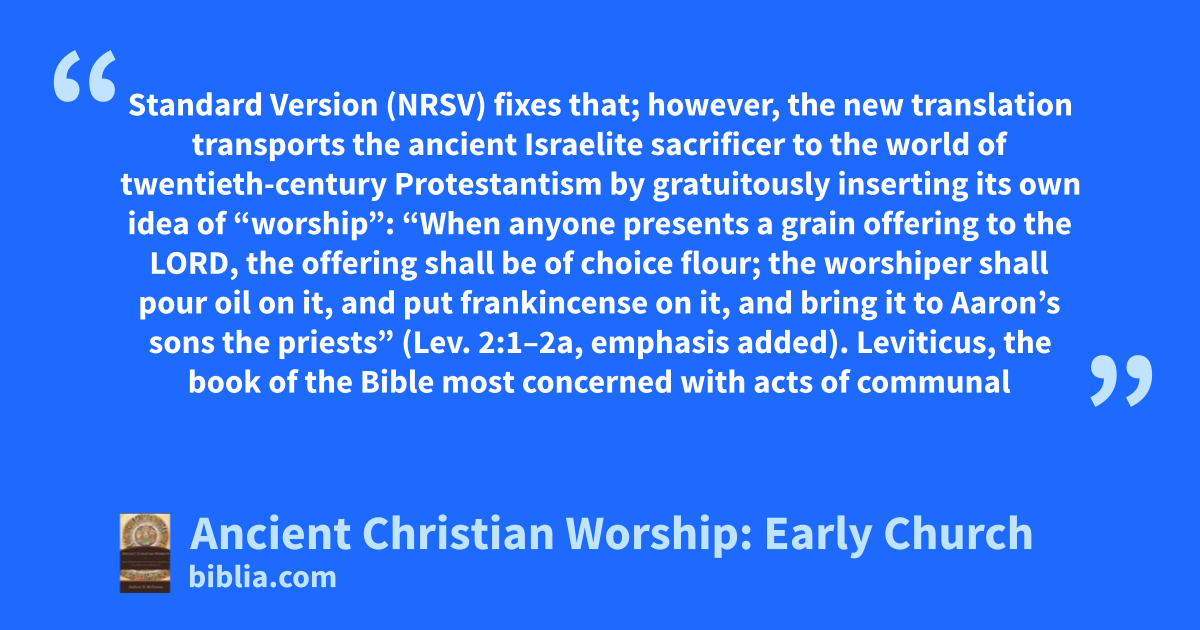 Standard Version (NRSV) fixes that; however, the new translation transports the ancient Israelite sacrificer to the world of twentieth-century Protestantism by gratuitously inserting its own idea of “worship”: “When anyone presents a grain offering to the LORD, the offering shall be of choice flour; the worshiper shall pour oil on it, and put frankincense on it, and bring it to Aaron’s sons the priests” (Lev. 2:1–2a, emphasis added). Leviticus, the book of the Bible most concerned with acts of communal