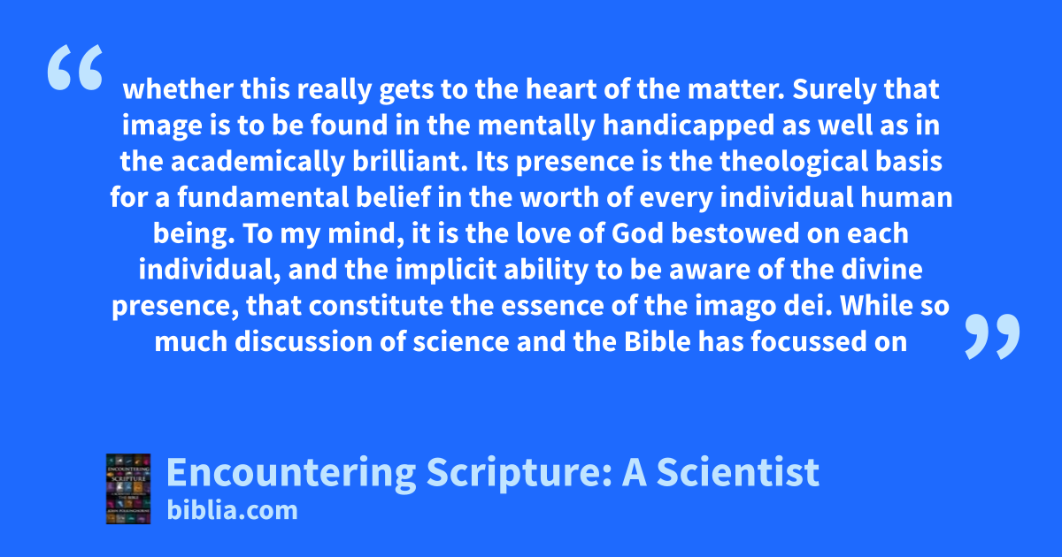whether this really gets to the heart of the matter. Surely that image is to be found in the mentally handicapped as well as in the academically brilliant. Its presence is the theological basis for a fundamental belief in the worth of every individual human being. To my mind, it is the love of God bestowed on each individual, and the implicit ability to be aware of the divine presence, that constitute the essence of the imago dei. While so much discussion of science and the Bible has focussed on