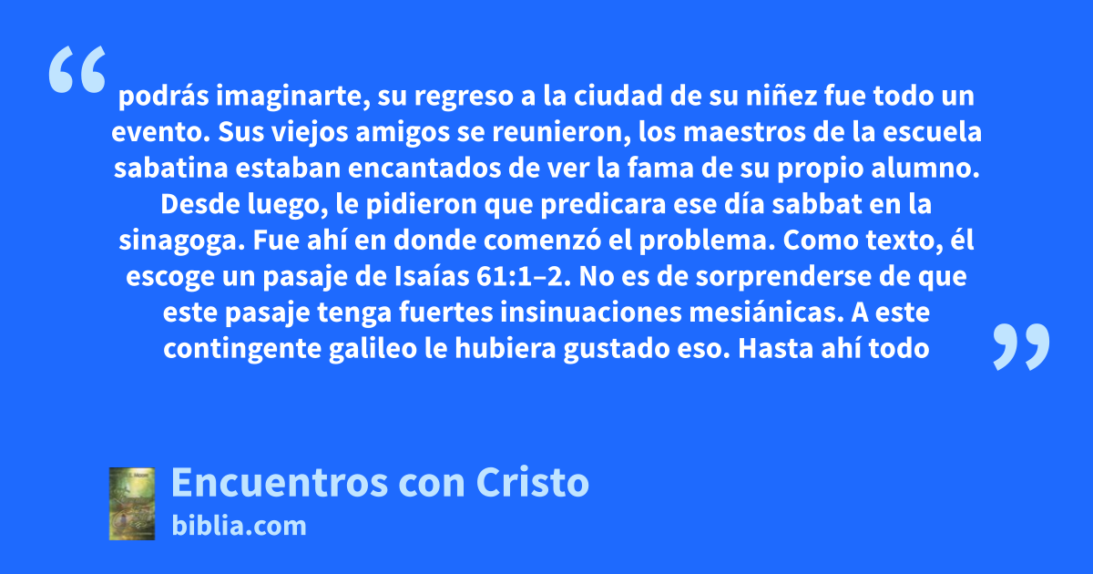 podrás imaginarte, su regreso a la ciudad de su niñez fue todo un evento. Sus viejos amigos se reunieron, los maestros de la escuela sabatina estaban encantados de ver la fama de su propio alumno. Desde luego, le pidieron que predicara ese día sabbat en la sinagoga. Fue ahí en donde comenzó el problema. Como texto, él escoge un pasaje de Isaías 61:1–2. No es de sorprenderse de que este pasaje tenga fuertes insinuaciones mesiánicas. A este contingente galileo le hubiera gustado eso. Hasta ahí todo