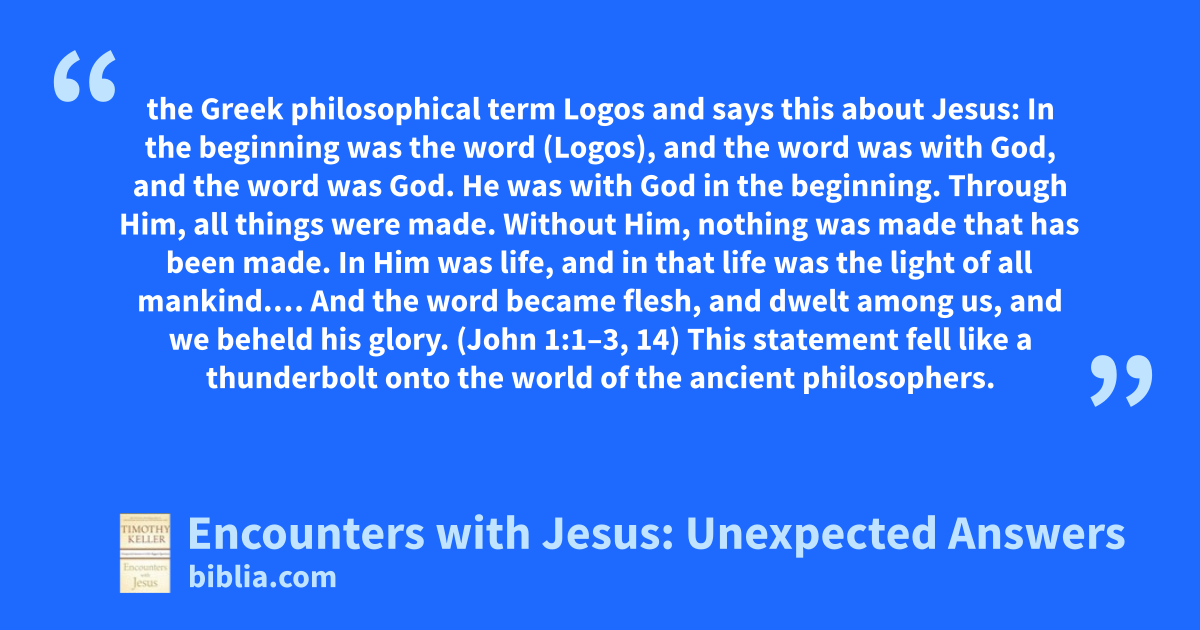 the Greek philosophical term Logos and says this about Jesus: In the beginning was the word (Logos), and the word was with God, and the word was God. He was with God in the beginning. Through Him, all things were made. Without Him, nothing was made that has been made. In Him was life, and in that life was the light of all mankind.… And the word became flesh, and dwelt among us, and we beheld his glory. (John 1:1–3, 14) This statement fell like a thunderbolt onto the world of the ancient philosophers.