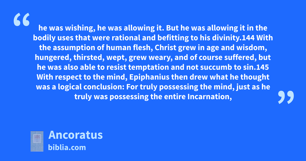 he was wishing, he was allowing it. But he was allowing it in the bodily uses that were rational and befitting to his divinity.144 With the assumption of human flesh, Christ grew in age and wisdom, hungered, thirsted, wept, grew weary, and of course suffered, but he was also able to resist temptation and not succumb to sin.145 With respect to the mind, Epiphanius then drew what he thought was a logical conclusion: For truly possessing the mind, just as he truly was possessing the entire Incarnation,