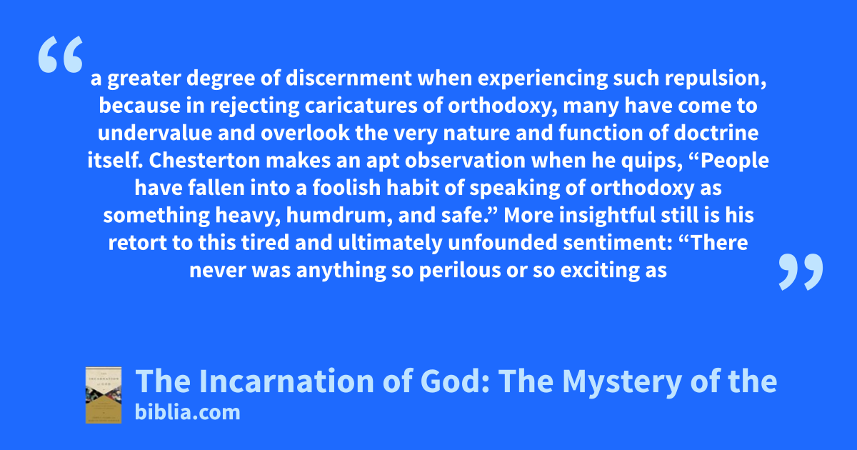 a greater degree of discernment when experiencing such repulsion, because in rejecting caricatures of orthodoxy, many have come to undervalue and overlook the very nature and function of doctrine itself. Chesterton makes an apt observation when he quips, “People have fallen into a foolish habit of speaking of orthodoxy as something heavy, humdrum, and safe.” More insightful still is his retort to this tired and ultimately unfounded sentiment: “There never was anything so perilous or so exciting as