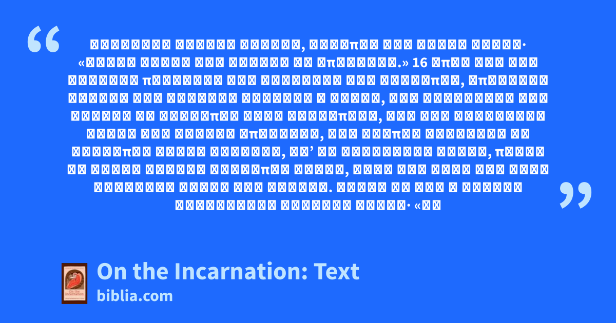 ἀληθινὸν ἑαυτοῦ Πατέρα, καθάπερ καὶ αὐτός φησιν· «Ἦλθον σῶσαι καὶ εὑρεῖν τὸ ἀπολωλός.» 16 Ἅπαξ γὰρ εἰς αἰσθητὰ πεσούσης τῆς διανοίας τῶν ἀνθρώπων, ὑπέβαλεν ἑαυτὸν διὰ σώματος φανῆναι ὁ Λόγος, ἵνα μετενέγκῃ εἰς ἑαυτὸν ὡς ἄνθρωπον τοὺς ἀνθρώπους, καὶ τὰς αἰσθήσεις αὐτῶν εἰς ἑαυτὸν ἀποκλίνῃ, καὶ λοιπὸν ἐκείνους ὡς ἄνθρωπον αὐτὸν ὁρῶντας, διʼ ὧν ἐργάζεται ἔργων, πείσῃ μὴ εἶναι ἑαυτὸν ἄνθρωπον μόνον, ἀλλὰ καὶ Θεὸν καὶ Θεοῦ ἀληθινοῦ Λόγον καὶ Σοφίαν. Τοῦτο δὲ καὶ ὁ Παῦλος βουλόμενος σημᾶναί φησιν· «Ἐν