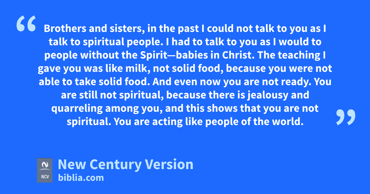 3 Brothers and sisters, in the past I could not talk to you as I talk to spiritual people. I had to talk to you as I would to people without the Spirit—babies in Christ. 2 The teaching I gave you was like milk, not solid food, because you were not able to take solid food. And even now you are not ready. 3 You are still not spiritual, because there is jealousy and quarreling among you, and this shows that you are not spiritual. You are acting like people of the world. 4 One of you says, “I belong to Paul,” and another says, “I belong to Apollos.” When you say things like this, you are acting like people of the world.