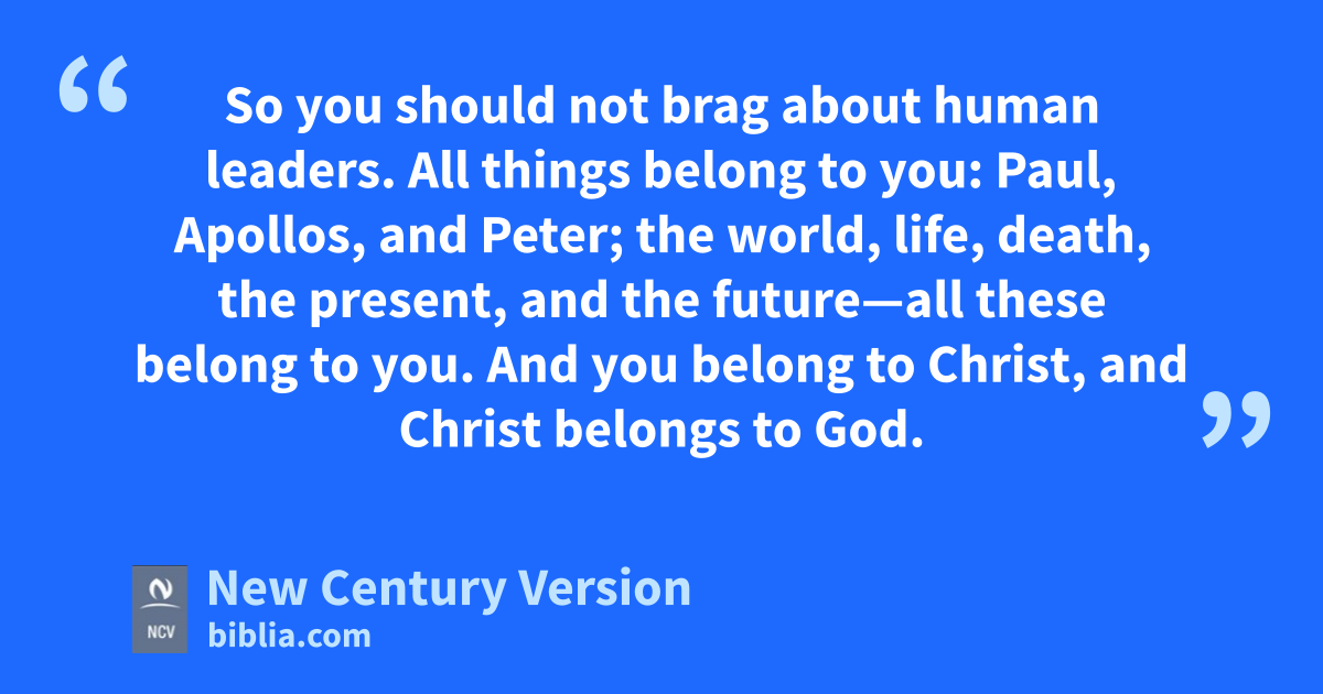 18 Do not fool yourselves. If you think you are wise in this world, you should become a fool so that you can become truly wise, 19 because the wisdom of this world is foolishness with God. It is written in the Scriptures, “He catches those who are wise in their own clever traps.”n 20 It is also written in the Scriptures, “The Lord knows what wise people think. He knows their thoughts are just a puff of wind.”n 21 So you should not brag about human leaders. All things belong to you: 22 Paul, Apollos, and Peter; the world, life, death, the present, and the future—all these belong to you. 23 And you belong to Christ, and Christ belongs to God.
