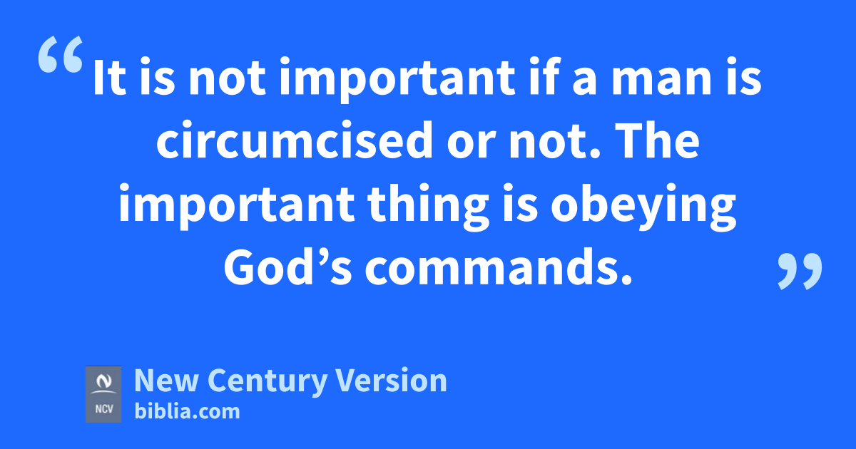 17 But in any case each one of you should continue to live the way God has given you to live—the way you were when God called you. This is a rule I make in all the churches. 18 If a man was already circumcised when he was called, he should not undo his circumcision. If a man was without circumcision when he was called, he should not be circumcised. 19 It is not important if a man is circumcised or not. The important thing is obeying God’s commands. 20 Each one of you should stay the way you were when God called you. 21 If you were a slave when God called you, do not let that bother you. But if you can be free, then make good use of your freedom. 22 Those who were slaves when the Lord called them are free persons who belong to the Lord. In the same way, those who were free when they were called are now Christ’s slaves. 23 You all were bought at a great price, so do not become slaves of people. 24 Brothers and sisters, each of you should stay as you were when you were called, and stay there with God.