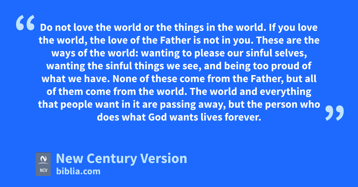 15 Do not love the world or the things in the world. If you love the world, the love of the Father is not in you. 16 These are the ways of the world: wanting to please our sinful selves, wanting the sinful things we see, and being too proud of what we have. None of these come from the Father, but all of them come from the world. 17 The world and everything that people want in it are passing away, but the person who does what God wants lives forever.
