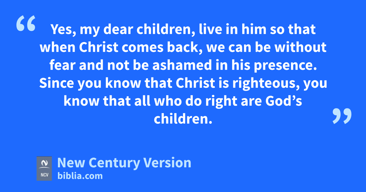 28 Yes, my dear children, live in him so that when Christ comes back, we can be without fear and not be ashamed in his presence. 29 Since you know that Christ is righteous, you know that all who do right are God’s children.
