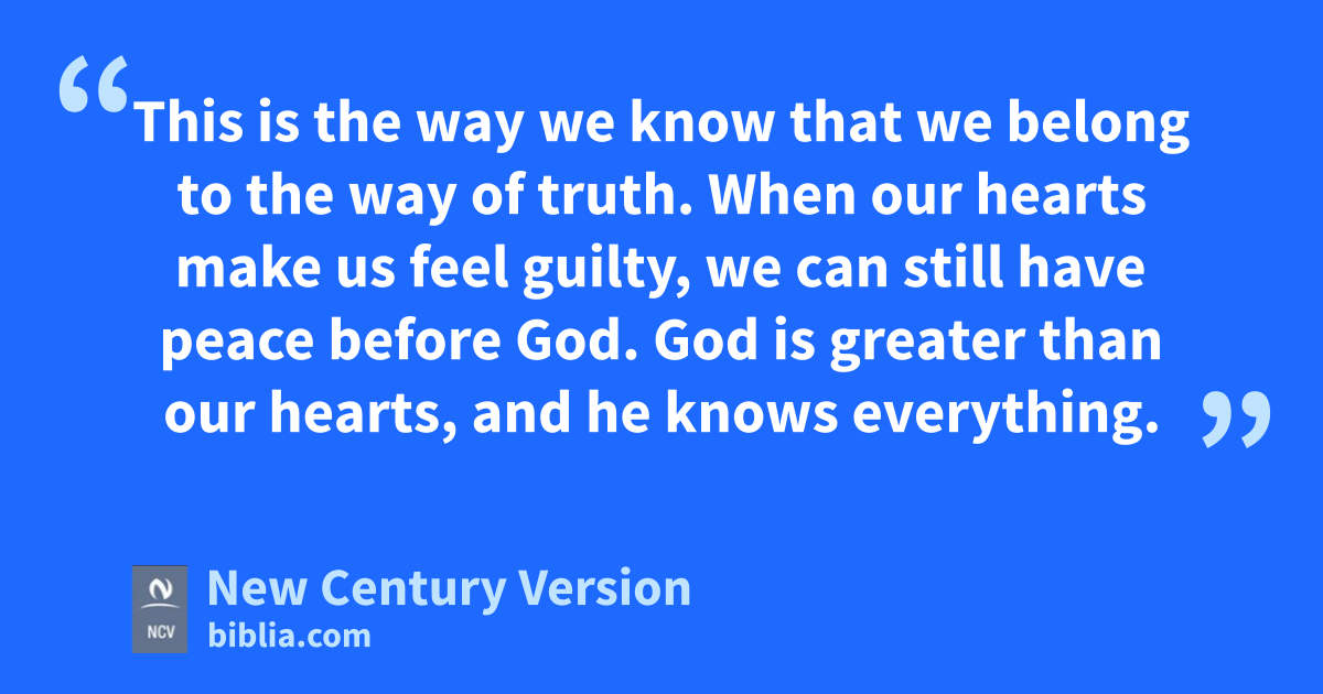 19–20 This is the way we know that we belong to the way of truth. When our hearts make us feel guilty, we can still have peace before God. God is greater than our hearts, and he knows everything. 21 My dear friends, if our hearts do not make us feel guilty, we can come without fear into God’s presence. 22 And God gives us what we ask for because we obey God’s commands and do what pleases him. 23 This is what God commands: that we believe in his Son, Jesus Christ, and that we love each other, just as he commanded. 24 The people who obey God’s commands live in God, and God lives in them. We know that God lives in us because of the Spirit God gave us.