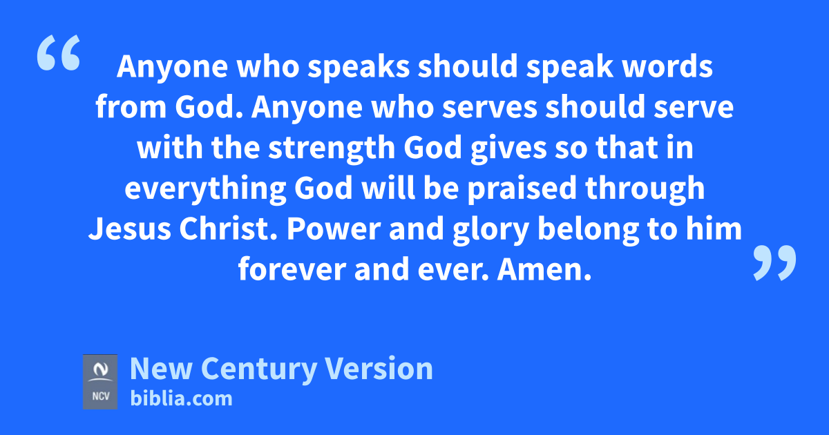 7 The time is near when all things will end. So think clearly and control yourselves so you will be able to pray. 8 Most importantly, love each other deeply, because love will cause people to forgive each other for many sins. 9 Open your homes to each other, without complaining. 10 Each of you has received a gift to use to serve others. Be good servants of God’s various gifts of grace. 11 Anyone who speaks should speak words from God. Anyone who serves should serve with the strength God gives so that in everything God will be praised through Jesus Christ. Power and glory belong to him forever and ever. Amen.