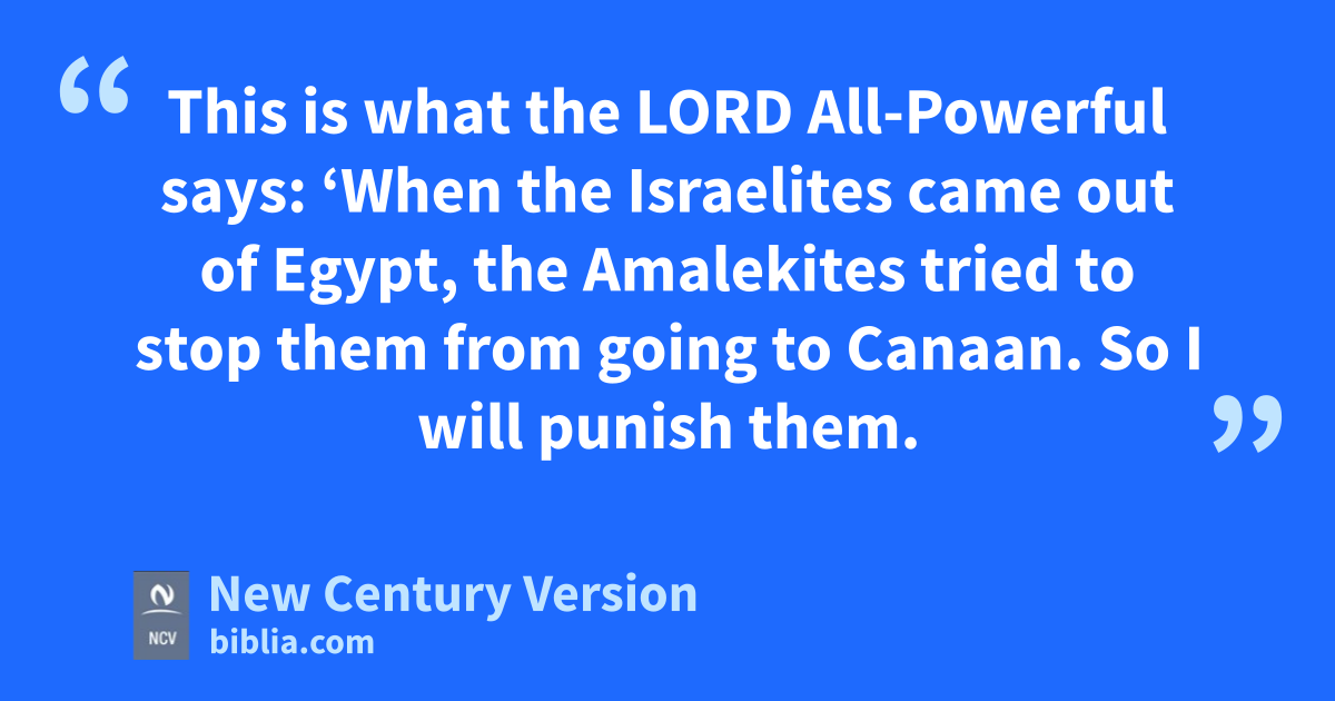 15 Samuel said to Saul, “The Lord sent me to appoint you king over Israel. Now listen to his message. 2 This is what the Lord All-Powerful says: ‘When the Israelites came out of Egypt, the Amalekites tried to stop them from going to Canaan. So I will punish them. 3 Now go, attack the Amalekites and destroy everything they own as an offering to the Lord. Don’t let anything live. Put to death men and women, children and small babies, cattle and sheep, camels and donkeys.’ ”