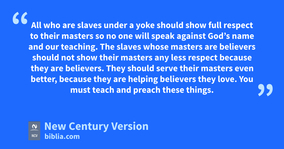 6 All who are slaves under a yoke should show full respect to their masters so no one will speak against God’s name and our teaching. 2 The slaves whose masters are believers should not show their masters any less respect because they are believers. They should serve their masters even better, because they are helping believers they love.