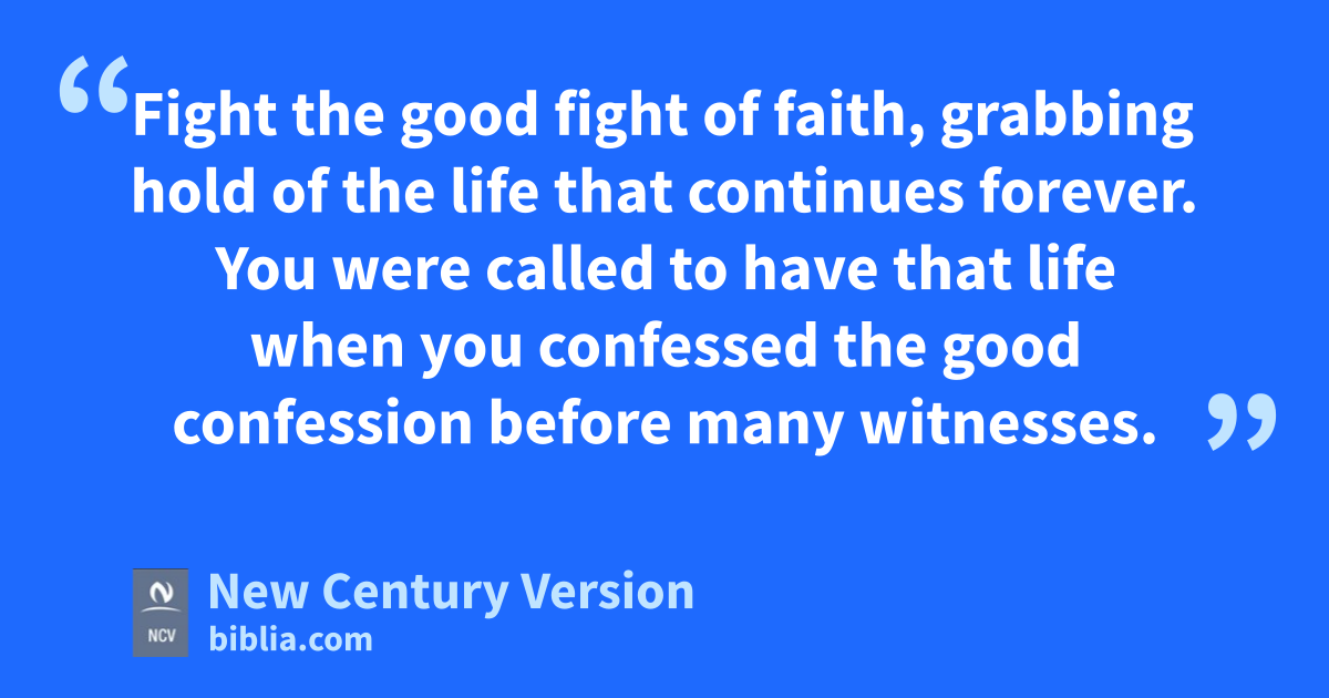 11 But you, man of God, run away from all those things. Instead, live in the right way, serve God, have faith, love, patience, and gentleness. 12 Fight the good fight of faith, grabbing hold of the life that continues forever. You were called to have that life when you confessed the good confession before many witnesses. 13 In the sight of God, who gives life to everything, and of Christ Jesus, I give you a command. Christ Jesus made the good confession when he stood before Pontius Pilate. 14 Do what you were commanded to do without wrong or blame until our Lord Jesus Christ comes again. 15 God will make that happen at the right time. He is the blessed and only Ruler, the King of all kings and the Lord of all lords. 16 He is the only One who never dies. He lives in light so bright no one can go near it. No one has ever seen God, or can see him. May honor and power belong to God forever. Amen.