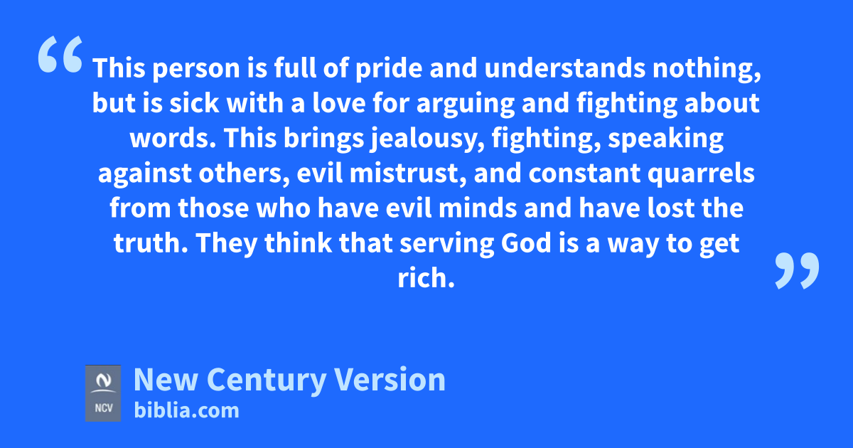 3 Anyone who has a different teaching does not agree with the true teaching of our Lord Jesus Christ and the teaching that shows the true way to serve God. 4 This person is full of pride and understands nothing, but is sick with a love for arguing and fighting about words. This brings jealousy, fighting, speaking against others, evil mistrust, 5 and constant quarrels from those who have evil minds and have lost the truth. They think that serving God is a way to get rich.