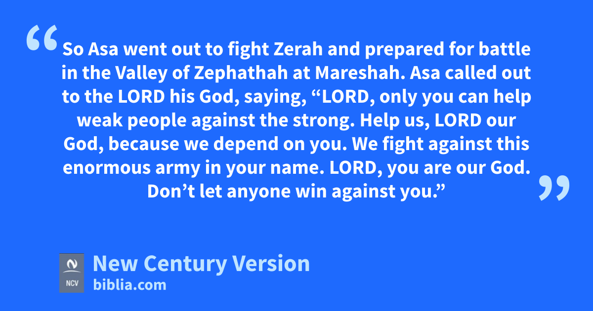 11 Asa called out to the Lord his God, saying, “Lord, only you can help weak people against the strong. Help us, Lord our God, because we depend on you. We fight against this enormous army in your name. Lord, you are our God. Don’t let anyone win against you.”
