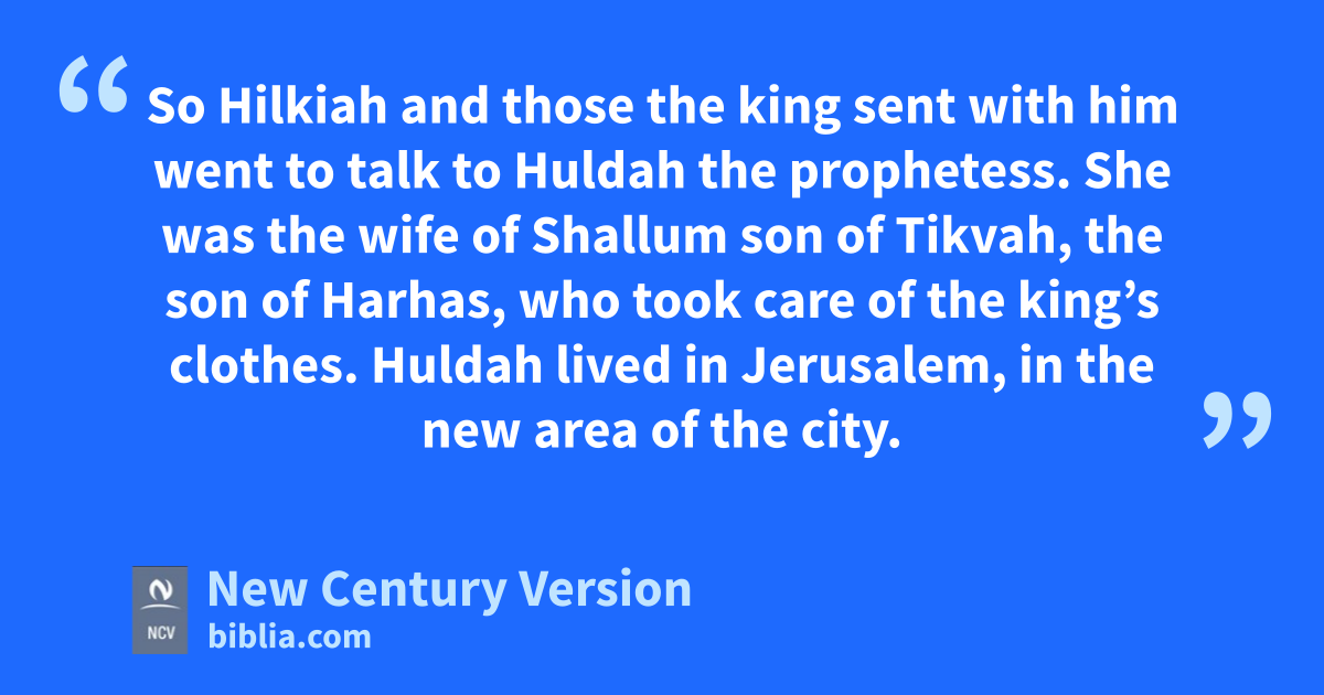 22 So Hilkiah and those the king sent with him went to talk to Huldah the prophetess. She was the wife of Shallum son of Tikvah, the son of Harhas, who took care of the king’s clothes. Huldah lived in Jerusalem, in the new area of the city.