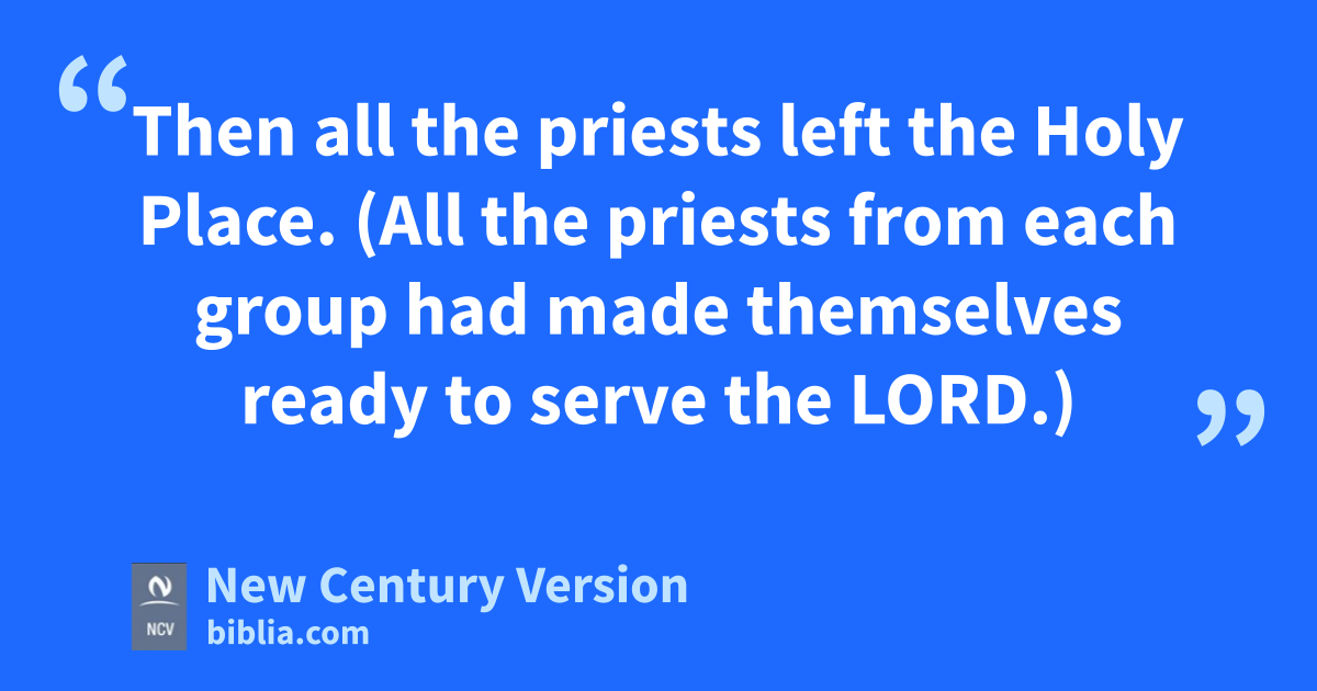 11 Then all the priests left the Holy Place. (All the priests from each group had made themselves ready to serve the Lord.) 12 All the Levite musicians—Asaph, Heman, Jeduthun, and all their sons and relatives—stood on the east side of the altar. They were dressed in white linen and played cymbals, harps, and lyres. With them were one hundred twenty priests who blew trumpets. 13 Those who blew the trumpets and those who sang together sounded like one person as they praised and thanked the Lord. They sang as others played their trumpets, cymbals, and other instruments. They praised the Lord with this song: