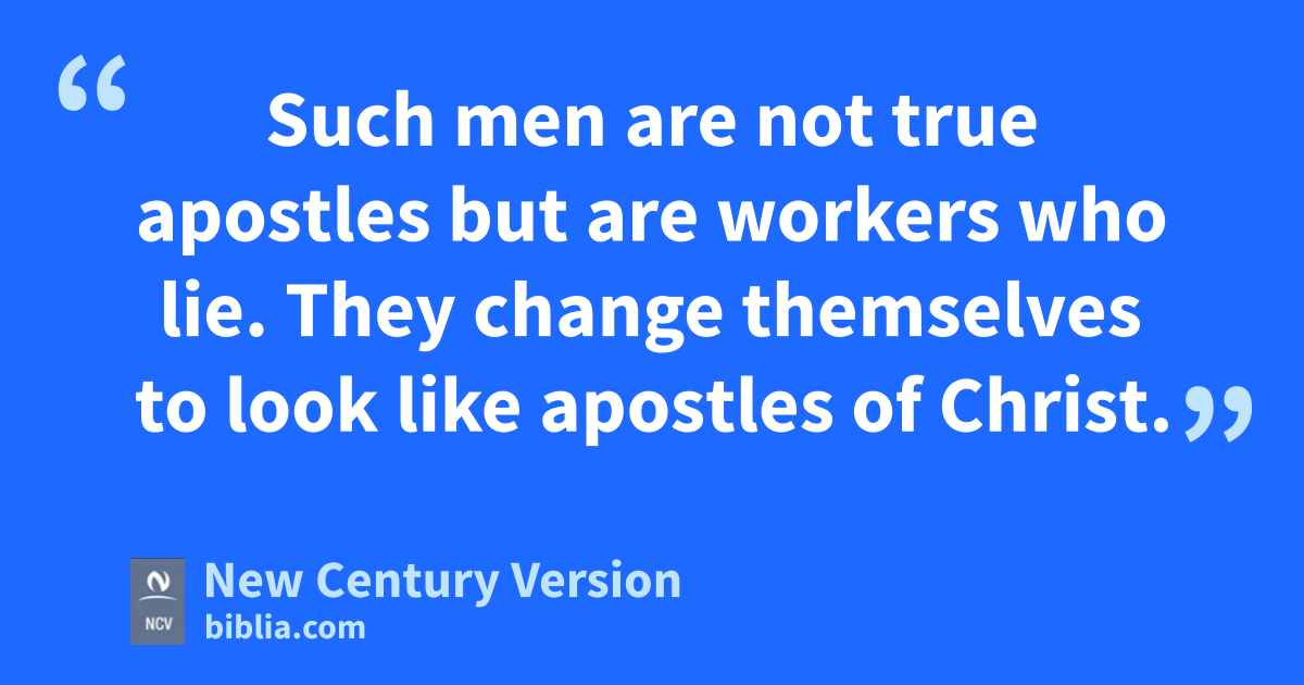 12 And I will continue doing what I am doing now, because I want to stop those people from having a reason to brag. They would like to say that the work they brag about is the same as ours. 13 Such men are not true apostles but are workers who lie. They change themselves to look like apostles of Christ. 14 This does not surprise us. Even Satan changes himself to look like an angel of light.n 15 So it does not surprise us if Satan’s servants also make themselves look like servants who work for what is right. But in the end they will be punished for what they do.