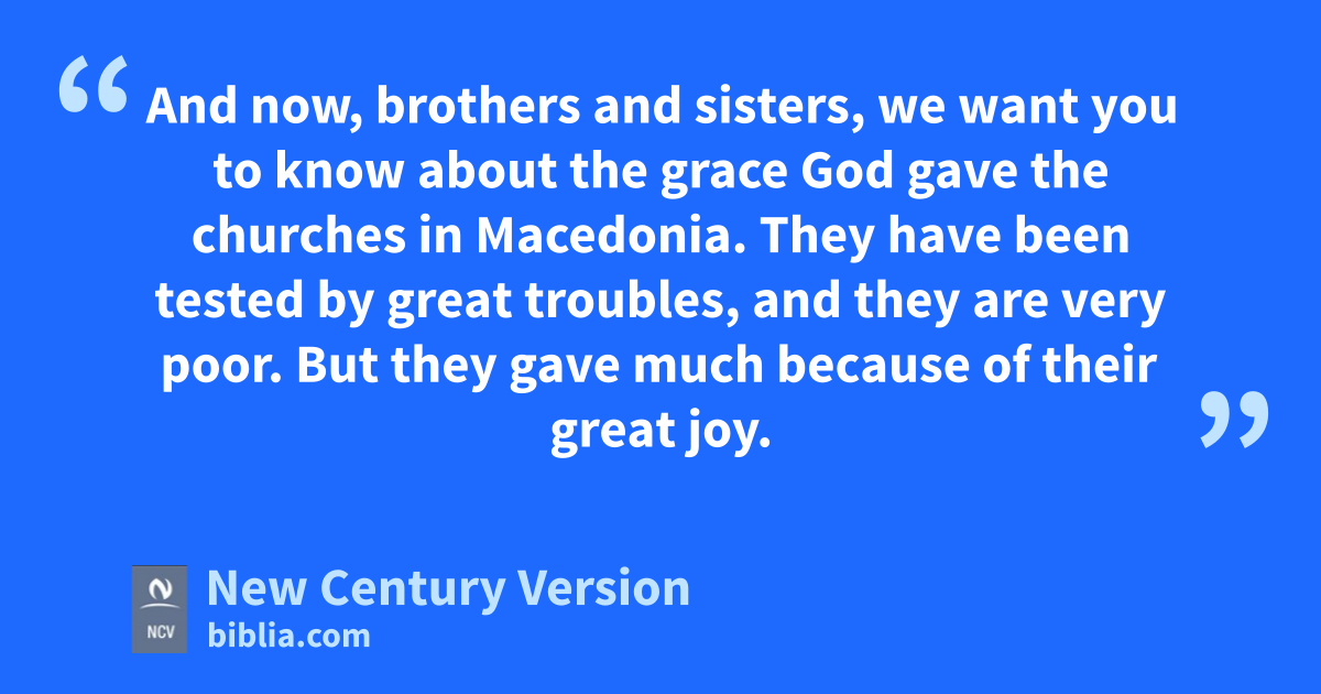 8 And now, brothers and sisters, we want you to know about the grace God gave the churches in Macedonia. 2 They have been tested by great troubles, and they are very poor. But they gave much because of their great joy. 3 I can tell you that they gave as much as they were able and even more than they could afford. No one told them to do it. 4 But they begged and pleaded with us to let them share in this service for God’s people. 5 And they gave in a way we did not expect: They first gave themselves to the Lord and to us. This is what God wants. 6 So we asked Titus to help you finish this special work of grace since he is the one who started it. 7 You are rich in everything—in faith, in speaking, in knowledge, in truly wanting to help, and in the love you learned from us. n In the same way, be strong also in the grace of giving.