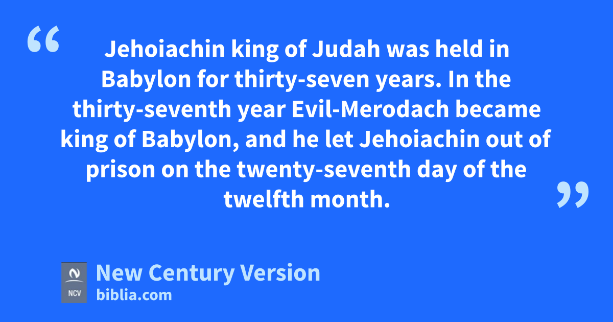 27 Jehoiachin king of Judah was held in Babylon for thirty-seven years. In the thirty-seventh year Evil-Merodach became king of Babylon, and he let Jehoiachin out of prison on the twenty-seventh day of the twelfth month. 28 Evil-Merodach spoke kindly to Jehoiachin and gave him a seat of honor above the seats of the other kings who were with him in Babylon. 29 So Jehoiachin put away his prison clothes. For the rest of his life, he ate at the king’s table. 30 Every day, for as long as Jehoiachin lived, the king gave him an allowance.