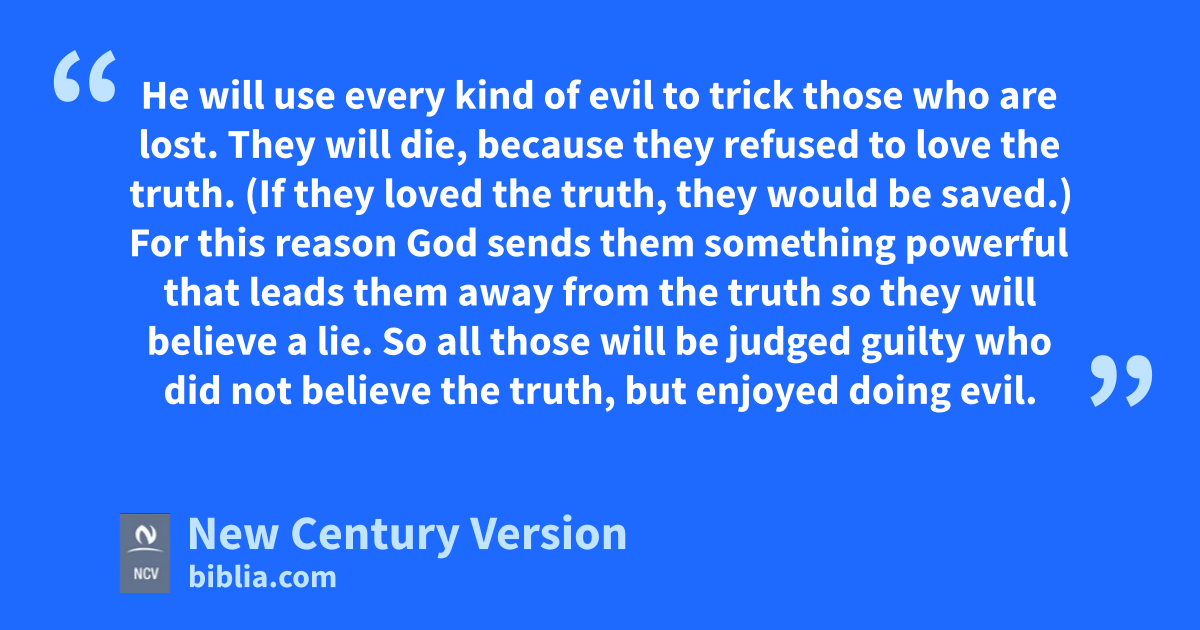 5 I told you when I was with you that all this would happen. Do you not remember? 6 And now you know what is stopping that Man of Evil so he will appear at the right time. 7 The secret power of evil is already working in the world, but there is one who is stopping that power. And he will continue to stop it until he is taken out of the way. 8 Then that Man of Evil will appear, and the Lord Jesus will kill him with the breath that comes from his mouth and will destroy him with the glory of his coming. 9 The Man of Evil will come by the power of Satan. He will have great power, and he will do many different false miracles, signs, and wonders. 10 He will use every kind of evil to trick those who are lost. They will die, because they refused to love the truth. (If they loved the truth, they would be saved.) 11 For this reason God sends them something powerful that leads them away from the truth so they will believe a lie. 12 So all those will be judged guilty who did not believe the truth, but enjoyed doing evil.