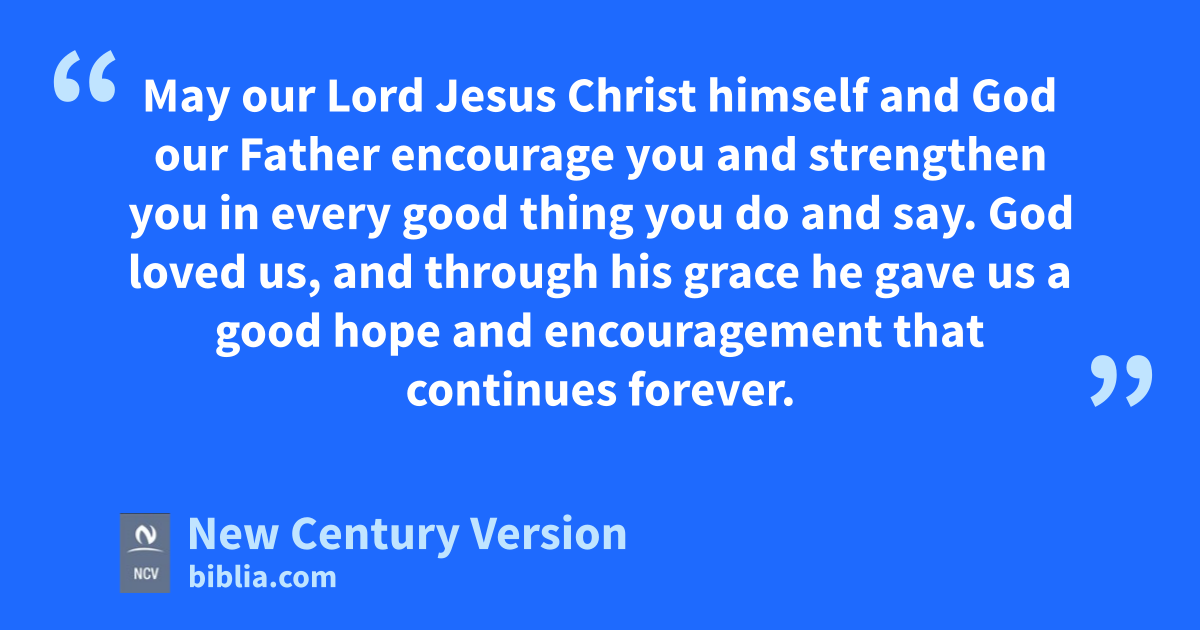16–17 May our Lord Jesus Christ himself and God our Father encourage you and strengthen you in every good thing you do and say. God loved us, and through his grace he gave us a good hope and encouragement that continues forever.