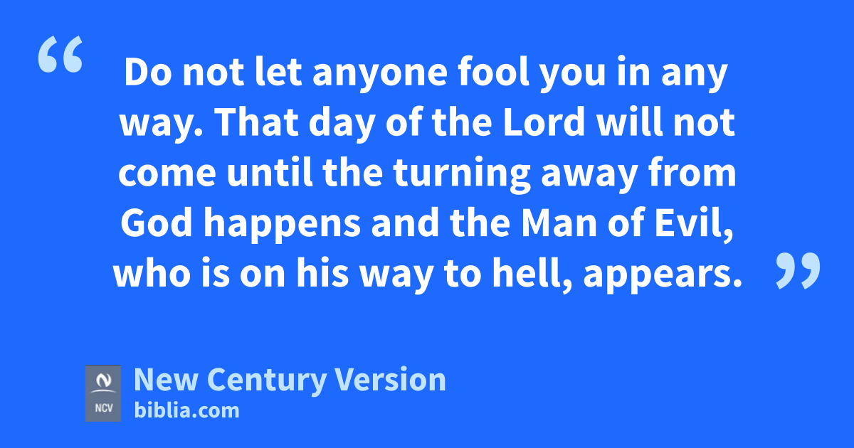 2 Brothers and sisters, we have something to say about the coming of our Lord Jesus Christ and the time when we will meet together with him. 2 Do not become easily upset in your thinking or afraid if you hear that the day of the Lord has already come. Someone may have said this in a prophecy or in a message or in a letter as if it came from us. 3 Do not let anyone fool you in any way. That day of the Lord will not come until the turning away n from God happens and the Man of Evil, n who is on his way to hell, appears. 4 He will be against and put himself above any so-called god or anything that people worship. And that Man of Evil will even go into God’s Temple and sit there and say that he is God.