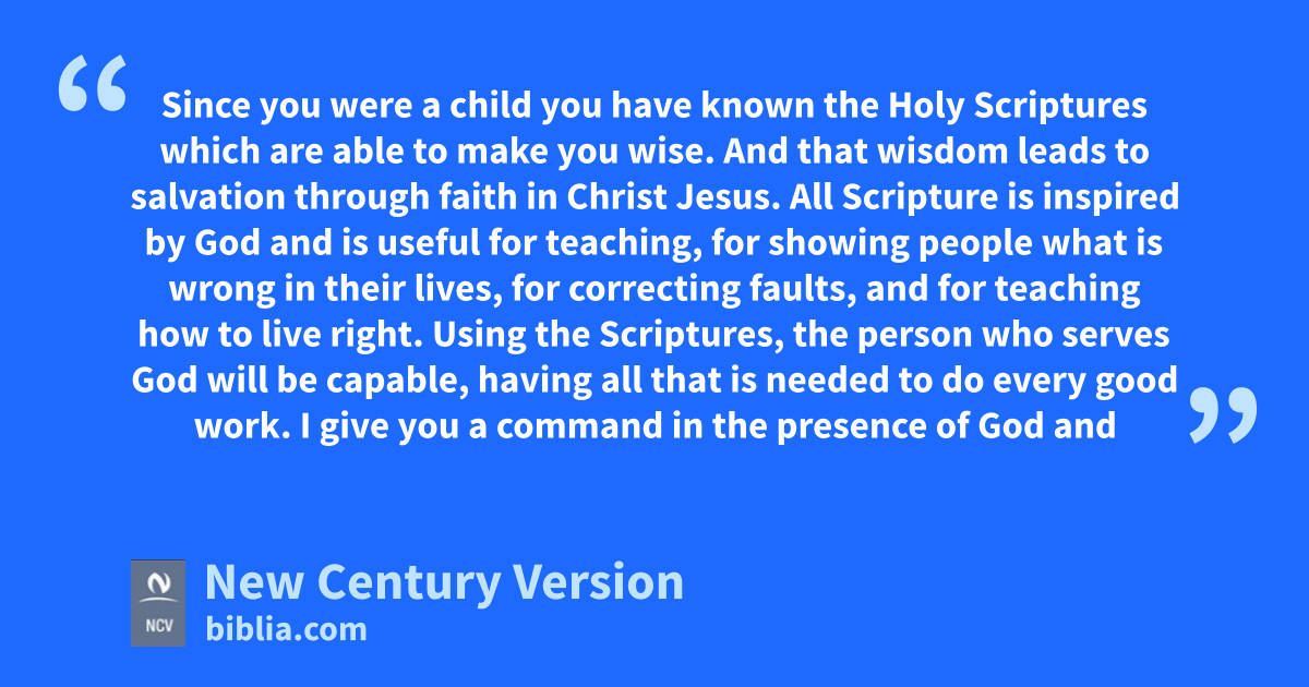 14 But you should continue following the teachings you learned. You know they are true, because you trust those who taught you. 15 Since you were a child you have known the Holy Scriptures which are able to make you wise. And that wisdom leads to salvation through faith in Christ Jesus. 16 All Scripture is inspired by God and is useful for teaching, for showing people what is wrong in their lives, for correcting faults, and for teaching how to live right. 17 Using the Scriptures, the person who serves God will be capable, having all that is needed to do every good work.