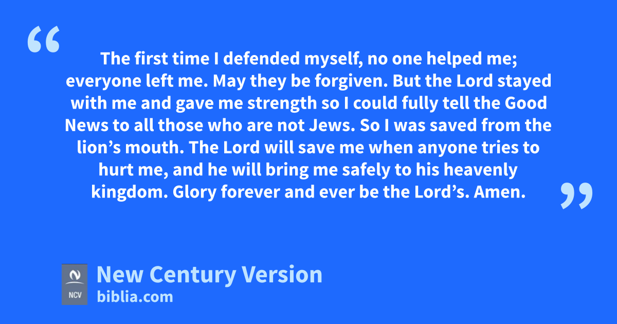 16 The first time I defended myself, no one helped me; everyone left me. May they be forgiven. 17 But the Lord stayed with me and gave me strength so I could fully tell the Good News to all those who are not Jews. So I was saved from the lion’s mouth. 18 The Lord will save me when anyone tries to hurt me, and he will bring me safely to his heavenly kingdom. Glory forever and ever be the Lord’s. Amen.
