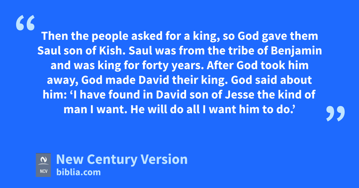 “After this, God gave them judges until the time of Samuel the prophet. 21 Then the people asked for a king, so God gave them Saul son of Kish. Saul was from the tribe of Benjamin and was king for forty years. 22 After God took him away, God made David their king. God said about him: ‘I have found in David son of Jesse the kind of man I want. He will do all I want him to do.’ 23 So God has brought Jesus, one of David’s descendants, to Israel to be its Savior, as he promised. 24 Before Jesus came, John n preached to all the people of Israel about a baptism of changed hearts and lives. 25 When he was finishing his work, he said, ‘Who do you think I am? I am not the Christ. He is coming later, and I am not worthy to untie his sandals.’