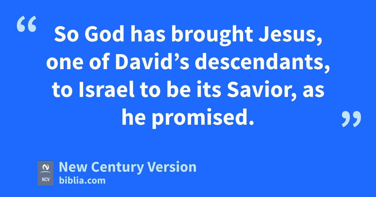 “After this, God gave them judges until the time of Samuel the prophet. 21 Then the people asked for a king, so God gave them Saul son of Kish. Saul was from the tribe of Benjamin and was king for forty years. 22 After God took him away, God made David their king. God said about him: ‘I have found in David son of Jesse the kind of man I want. He will do all I want him to do.’ 23 So God has brought Jesus, one of David’s descendants, to Israel to be its Savior, as he promised. 24 Before Jesus came, John n preached to all the people of Israel about a baptism of changed hearts and lives. 25 When he was finishing his work, he said, ‘Who do you think I am? I am not the Christ. He is coming later, and I am not worthy to untie his sandals.’