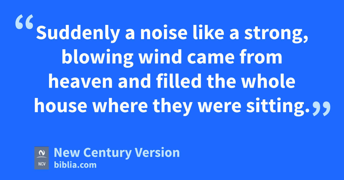 2 When the day of Pentecost came, they were all together in one place. 2 Suddenly a noise like a strong, blowing wind came from heaven and filled the whole house where they were sitting. 3 They saw something like flames of fire that were separated and stood over each person there. 4 They were all filled with the Holy Spirit, and they began to speak different languages n by the power the Holy Spirit was giving them.